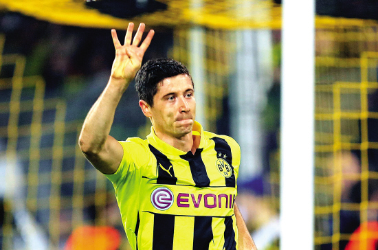 2013年4月25日,在欧冠半决赛多特蒙德4-1击败“银河战舰”皇马中,莱万多夫斯基史无前例地完成“大四喜”,一举打破三大历史纪录,成为冠军联赛首个对皇马独中四元、欧冠半决赛中首位上演“大四喜”的球员以及欧冠中进球最多的波兰人,莱万多夫斯基也将被记入欧冠史册。而遗憾的是,在后来的欧冠决赛中,莱万面对着联赛老对手拜仁慕尼黑,被罗本在最后时刻绝杀屈居亚军无缘登顶欧冠。