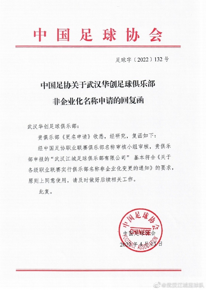 中国足协批复:同意中乙武汉华创更名为武汉江城rigeman @懂球帝2022-04-15 16:58北京时间4月15日,据武汉江城足球俱乐部官方消息,中国足协已经正式复函该俱乐部,同意他们更名。中国足协复函说:贵俱乐部《更名申请》收悉,经研究,复函如下:经中国足协职业联赛俱乐部名称审核小组审核,贵俱乐部申报的“武汉江城足球俱乐部有限公司”基本符合《关于各级职业联赛实行俱乐部名称非企业化变更的通知》的要求,原则上同意使用,请及时做好后续相关工作。此复。展开更多