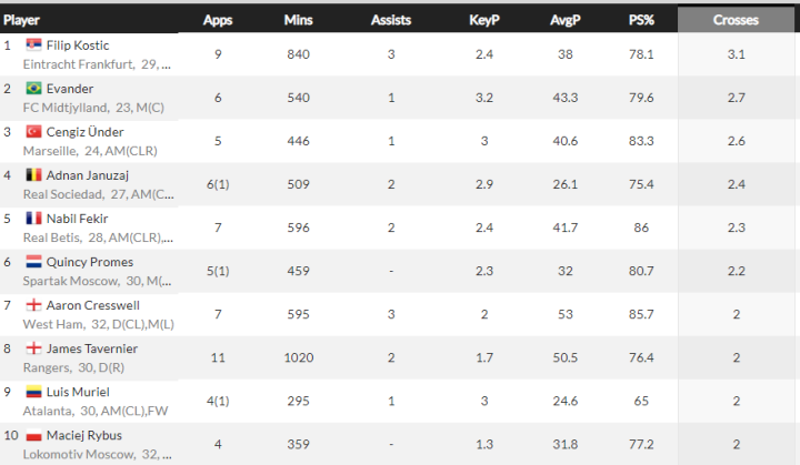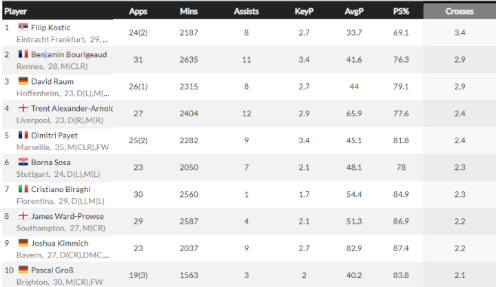 科斯蒂奇的传中能力究竟有多强呢?在数据上,他就是五大联赛第一。本赛季的欧联杯,科斯蒂奇场均精准传中3.1次排名赛事第一。在五大联赛传中榜单上,科斯蒂奇场均成功3.4次依然是第一,要知道阿诺德和帕耶特这样的顶级传球手的联赛场均成功传中也只是为2.4次。