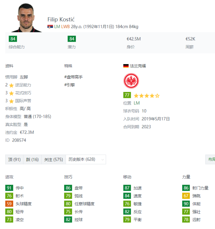 罗马也一直对科斯蒂奇情有独钟,因为穆里尼奥希望通过引进科斯蒂奇这样的边路球员来改革球队战术。当年在切尔西,穆帅账下达夫和罗本的快打旋风让人眼前一亮,在皇马慧眼识珠引进并重用迪马利亚让球队成为全欧反击最强。跑动勤勉、乐于防守、技术不俗的科斯蒂奇(FIFA22中他的体能和传中数值分别为90和91),绝对是穆里尼奥的菜,今夏他们会联手吗?