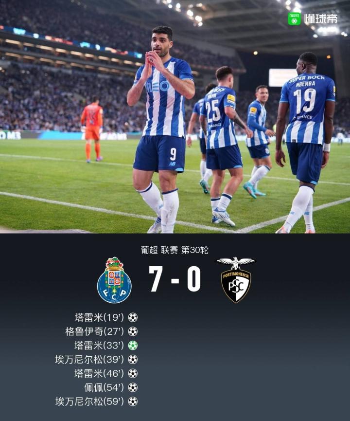 北京时间4月17日03:30,葡超第30轮继续进行,波尔图坐镇主场迎战波尔蒂芒人。上半场,塔雷米完成两射一传,格鲁伊奇与埃万尼尔松分别建功,波尔图半场便4-0领先。下半场,塔雷米再下一城上演帽子戏法,老将佩佩头球建功,埃万尼尔松再入一球完成双响。最终,波尔图主场7-0狂胜波尔蒂芒人。