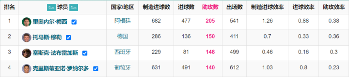 但是人们常常也忽略了C罗的传球脚法和助攻能力。早在曼联时期,C罗的下底传中就已锤炼得十分精准了,而在皇马的9个赛季C罗又5个赛季的联赛助攻数都上双了。C罗目前在五大联赛总共送出了140次助攻,排名现役第4,仅次于梅西、穆勒和小法。而在欧冠助攻榜上,无论是欧足联官方数据还是OPTA数据,C罗都占据着历史第一位。