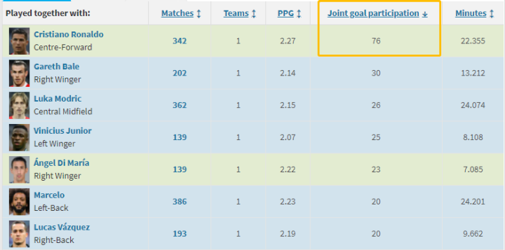 本泽马的这番话并非是朋友间的商业互吹,根据德国转会市场的统计,本泽马和C罗在比赛中总共完成了76个合作进球,是本泽马生涯的最佳搭档,而贝尔则是本泽马生涯第二搭档,两人合作进球数为30粒,这个数字远低于和C罗互相助攻进球的数据。