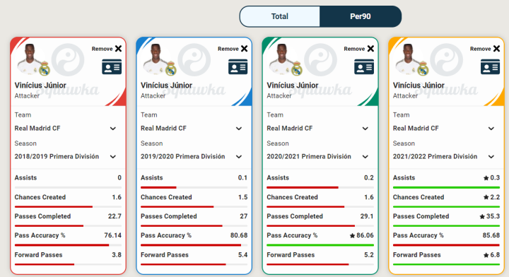 加盟皇马第四季,维尼修斯的本赛季的成长肉眼可见,squawka每90分钟数据中,维尼修斯本赛季在西甲的助攻、机会创造、准确传球数和向前传球数均为生涯新高。联赛中14球7助攻两项数据均创生涯新高,甚至比前三个赛季之和还要高。