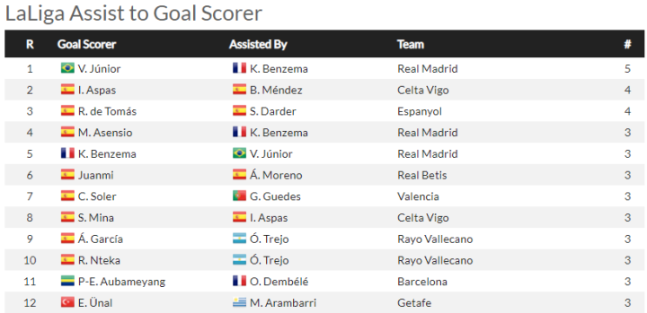 在维尼修斯本赛季西甲的7次助攻中,他有3次都送给了本泽马,而本泽马则给维尼修斯送出了5次助攻,他们两人是西甲最佳喂吃饼组合。