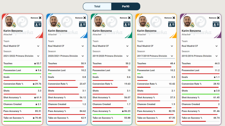 本赛季的本泽马,在西甲每90分钟的触球、丢失球权、射门进球转化率、射正率、机会创造数、过人成功率,均达到了生涯最佳数据。