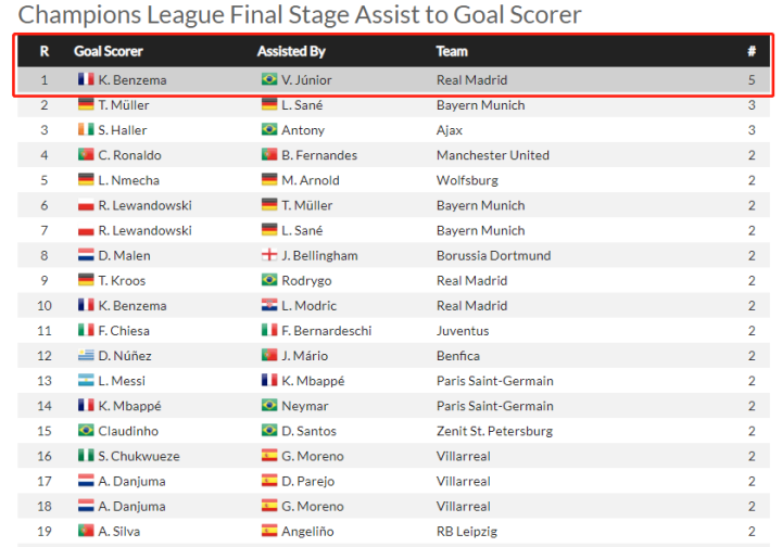 而欧冠赛场他和本泽马也心有灵犀,送出了6次助攻和B费、萨内并列助攻榜榜首,考虑到B费和萨内所在球队已被淘汰,维尼修斯有可能会独享本赛季的欧冠助攻王。一定不能漏掉的信息是,维尼修斯这6次助攻,竟然有5次都送给了本泽马,这其中包括了对阵巴黎本泽马逼抢多纳鲁马失误后,维尼修斯抢下皮球给本泽马的关键助攻,又包括了上一场欧冠对切尔西在加时赛上本泽马制胜头球的传中。