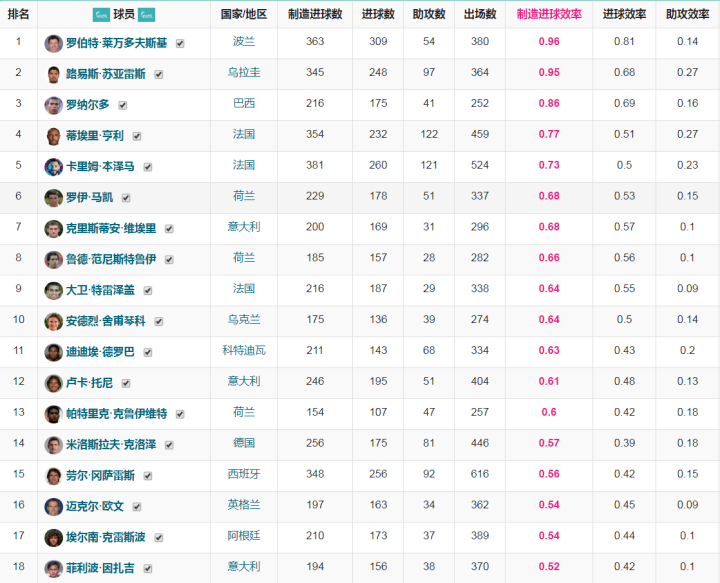 (三大中锋和一些历史中锋五大联赛制造进球数据对比,数据来源:仰卧撑足球数据库)