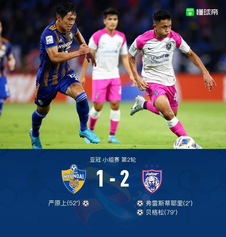 蔚山现代爆冷1-2不敌柔佛新山,严原上破门,贝格松制胜球