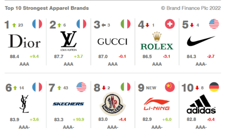 其中在Dior、LV等奢侈品牌的包围下,运动品牌占据四个席位,耐克、斯凯奇、李宁和阿迪达斯分别排名第5、第7、第9和第10名。值得一提的是,位于第九的李宁是首次入榜,也成为了全球十大最强品牌榜单中唯一的国产品牌。同样首次进入十强的运动品牌还有位于第七的斯凯奇,品牌价值增长68%至32亿美元。