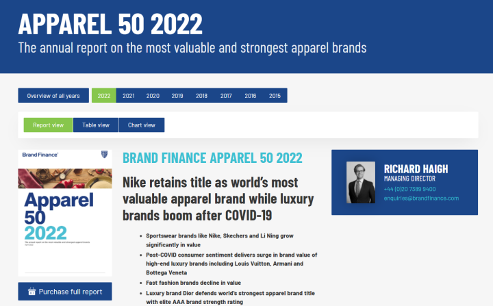 Brand Finance董事总经理Richard Haigh表示:“自疫情爆发以来,服装行业的市场动态发生了巨大变化,随着奢侈品和运动品牌掌握了以便利为核心的营销策略,推出了在线支付和配送的服务。加上以DTC渠道优先的营销活动,该行业品牌在疫情肆虐和供应链危机中保持稳定增长。”