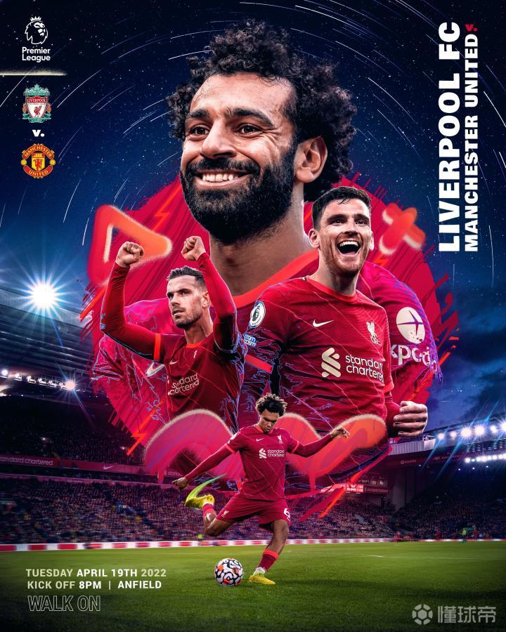 安菲尔德迎战曼联,利物浦官方发布双红会海报ETChalmers @懂球帝2022-04-19 15:00北京时间4月20日凌晨,英超第30轮补赛,利物浦将主场对阵曼联,赛前,利物浦官方发布双红会海报。目前,利物浦积73分位居积分榜次席,仅落后领头羊曼城1分,而曼联积54分排名第五,距欧冠区仅3分,这是一场关乎争冠和争四的双红会。赛前,利物浦官方发布比赛海报,萨拉赫、亨德森、罗伯逊和阿诺德出镜。展开更多