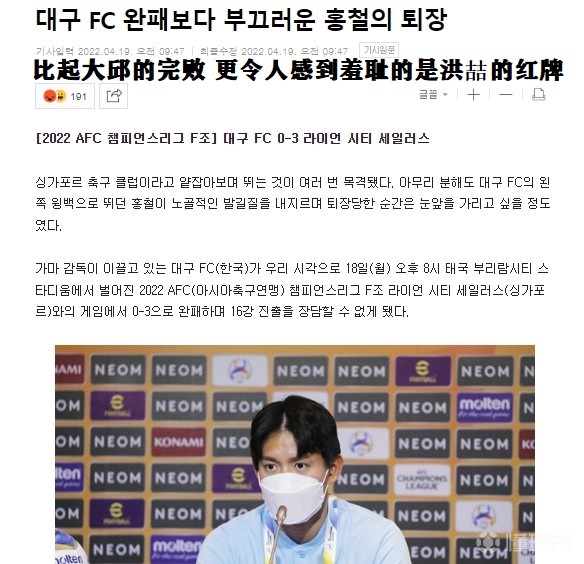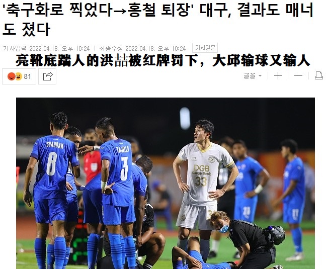 韩媒:大邱红牌输球又输人。昨晚的亚冠赛场,K联赛...马君华 @懂球帝2022-04-19 15:00韩媒:大邱红牌输球又输人。昨晚的亚冠赛场,K联赛球队大邱FC被新加坡球队狮城水手零封,0-3完败在对手脚下。韩国国脚洪喆在比赛中踹人被罚下,赛后遭到韩国媒体的严厉抨击。展开更多