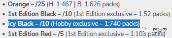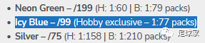 另外有10位球员存在SSP变化版,Hobby盒插入比例是1:776包,差不多每32盒1张(手雷盒插入比例为1:1052包,即150盒1张)。