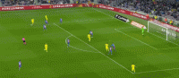 两个赛季后的2017-18赛季,佩雷斯再一次在西甲攻破了巴萨的球门,佩雷斯在禁区内接队友博尔哈-瓦莱精准传球,不停球顺势推了一个死角。