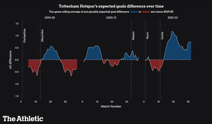 下面这幅图,显示了随着时间的推移,热刺的预期进球数量的变化。在这个图表中,创造机会的质量和失球数量也被考虑在内。