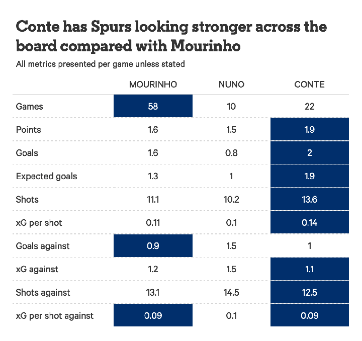 但自从孔蒂11月上任以来,预期进球的数量显著提升,这表明他们在攻防两端都交出了比对手更出色的表现。得益于进攻火力的复苏,孔蒂的球队在攻防两端的整体表现,已经达到了领先穆里尼奥时代的更高水准。
