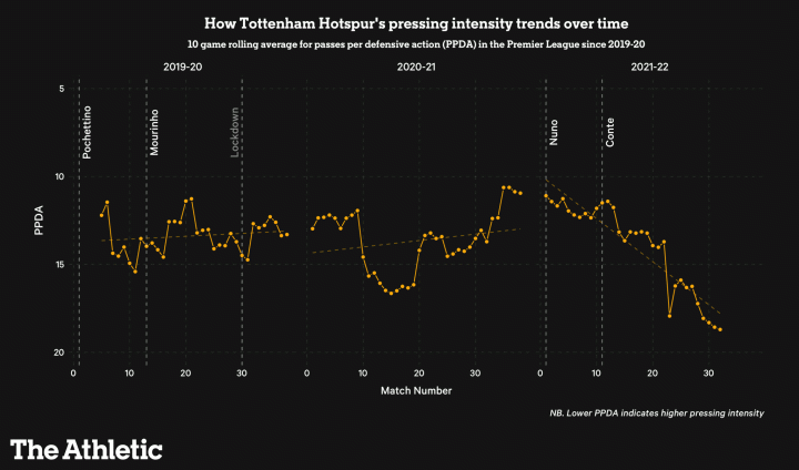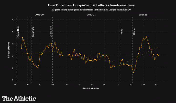 在进攻端,孔蒂的热刺明显更有激情。从意大利人执教的第一场比赛起,热刺的直接进攻(从己方半场开始,在15秒内形成射门或在对方禁区完成触球)就数量激增,尽管后来有所减少,但已经高于穆里尼奥时代的平均水平。