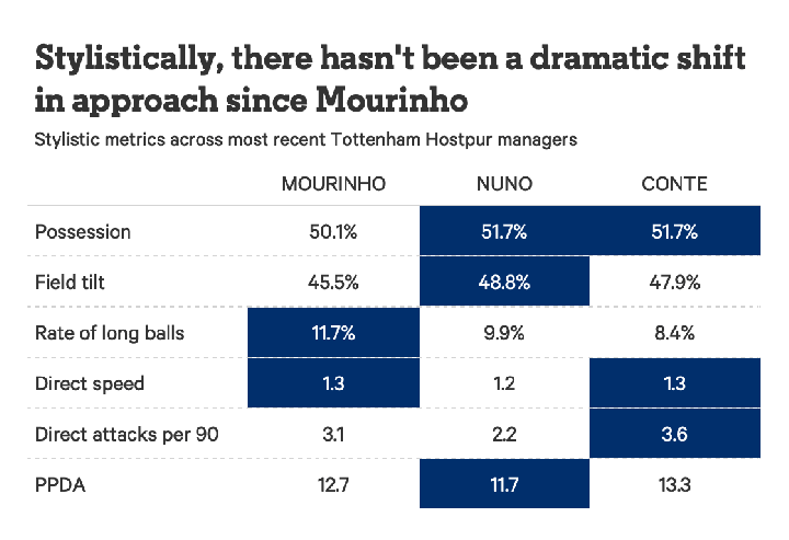 至于战术风格,你很难说孔蒂和穆里尼奥有什么明显不一样的地方,这是相当有趣的。或许,主打反击的风格,才是这批热刺球员们真正喜爱并且擅长的。关于比赛风格的看法,是球迷们转而反对穆里尼奥的主要原因,而且肯定也影响了球队主席丹尼尔-列维的看法。在解雇穆里尼奥一个月后,列维表示,热刺“失去了我们的DNA”,因此,他需要寻找一个“打法开放、注重进攻、风格养眼”的主教练作为继任者。