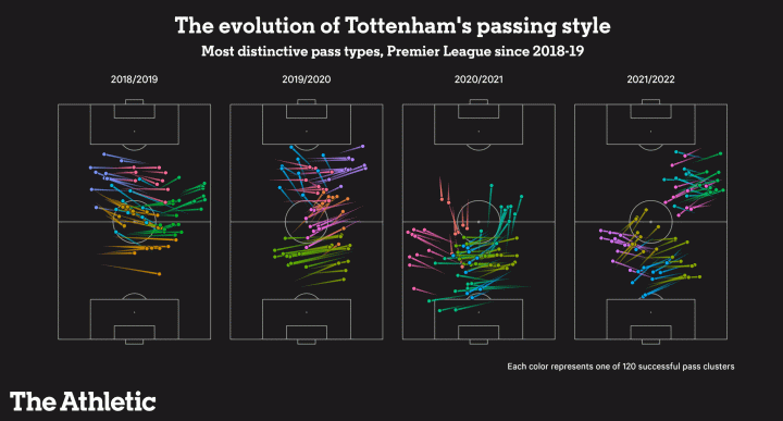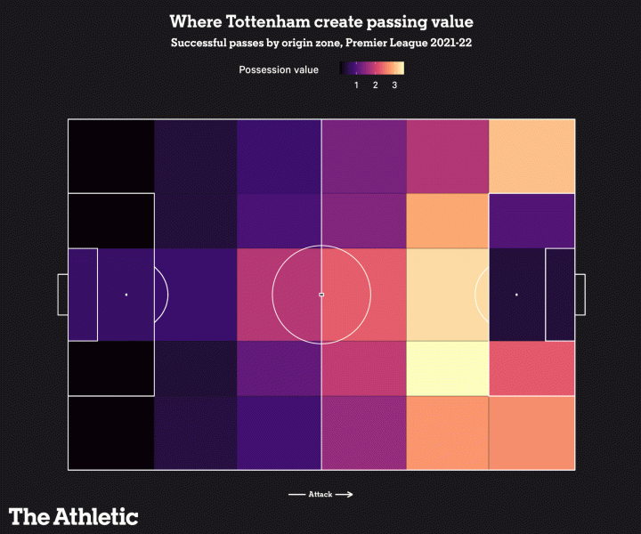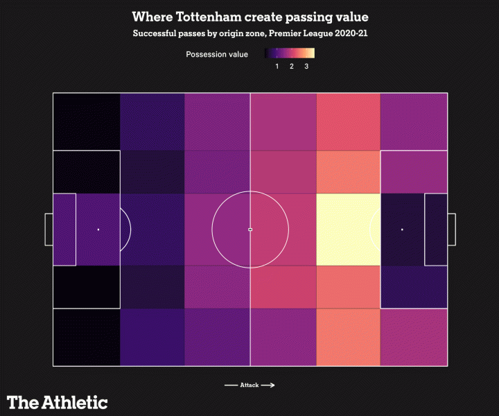 从本赛季和上个赛季的数据来看,我们可以看到热刺现在更多地在边路和半场空间进行威胁传球的尝试,而不仅仅是局限于中路。