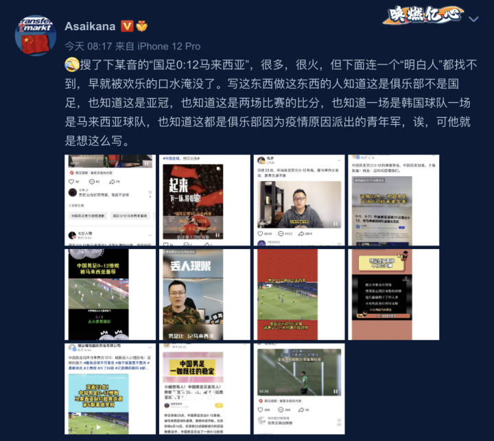 之后,就是一些大家都熟悉的剧情了。从短视频平台开始,到各大社交平台上,营销号们都将“国足0-12马来西亚”作为了流量密码。更有甚者,我看到过额一个大言不惭的娱乐新闻营销号,声称自己“贼心不死深夜看国足,谁知道怎么就又输了一个0-12”……
