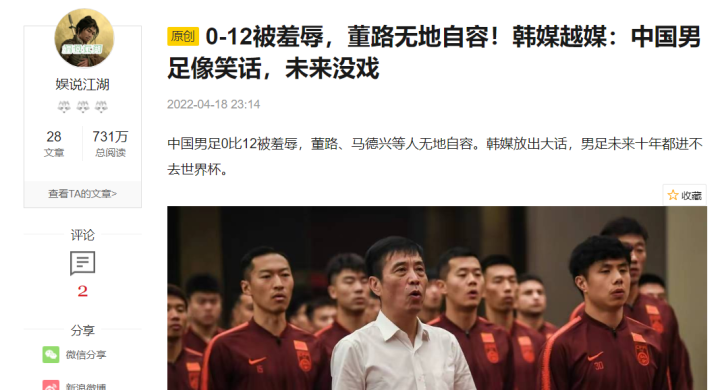 将0-12与中国足球近期的热点人物董路联系起来,并用YY和胡勒的手法,以韩媒的口吻添油加醋,配上一张国足的图片,实在是不要脸的典范。