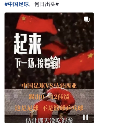 用中国足球VS马来西亚,直击痛点,对比篮球兵乓球后,再加上海参讽刺,连续暴击,同时为下一场留下悬念,犹如让国足陷入输球和挨骂的无限循环中。
