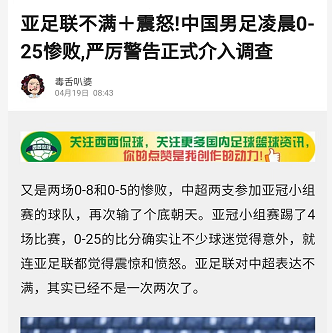 叶公好球专栏你知道吗?中国足球最近又制造惨案了,准确说是中国男足,先是0-12输给了马来西亚,现在又输了一个0-25。亚足联都震怒了,现在正式介入调查了,有大戏看了!