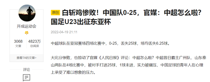 把12-0和13-0结合在一起,搞出25-0的震撼标题,同时断章取义,用一篇比赛前的亚足联官员采访,直接编出严厉警告和介入调查,堪称标题党和假新闻完美结合的集大成者,实在是恶心至极,无敌恶毒,文如其人。