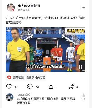诸如以上这类的谣言和近乎辱骂式的抹黑,还有很多很多。可最令人无奈的,不是这些谣言的传播,而是很多球迷真的相信这些了事!更有人表示,足协掌门人陈戌源涉及问题,要蹲监狱了。
