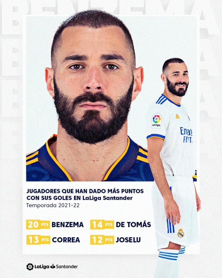 本泽马本赛季西甲进球为皇马多拿了20分,德托马斯14分居第二LaPulga @懂球帝2022-04-20 19:43据西甲官方统计,本泽马的进球为皇马在本赛季西甲多拿了20分,为所有球员中第一。排名第二的则是西班牙人前锋德托马斯,他的进球为西班牙人多拿了14分。本赛季西甲进球为球队多带来积分TOP4球员20分 本泽马 皇家马德里14分 德托马斯 西班牙人13分 安赫尔-科雷亚 马德里竞技12分 何塞卢 阿拉维斯展开更多