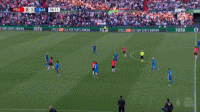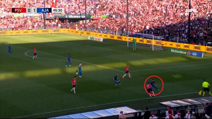 右侧更甚,埃因霍温的左边锋加克波个高腿长,刚好比马兹拉维大了一圈,压制住这一侧,埃因霍温开场就从这个区域打出了两次进攻: