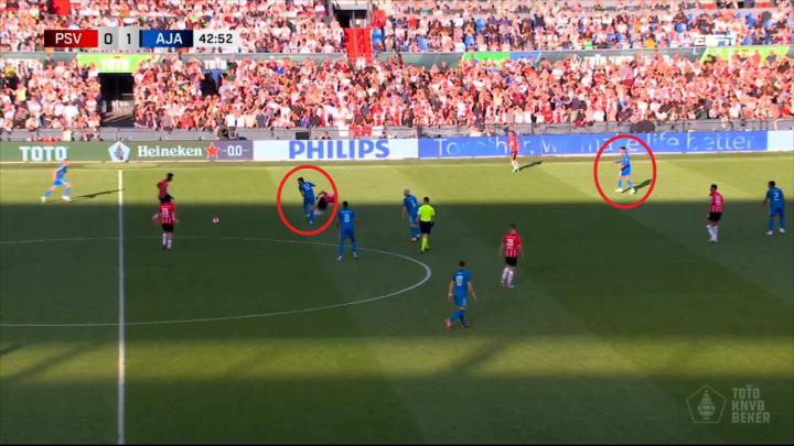 他先是在中场对抗了一下,让布林德将球传给了塔迪奇,然后在塔迪奇被迫停下时,前插到肋部再对抗一下,这才有了阿贾克斯后来集聚人手,换来局部小配合和定位球。