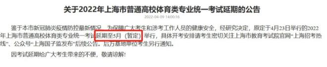 上海市教育考试院于4月9日官宣:原定于4月23日举行的2022年上海市普通高校体育类专业统一考试延期至5月(暂定)举行。