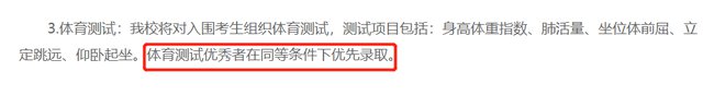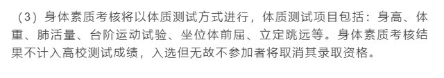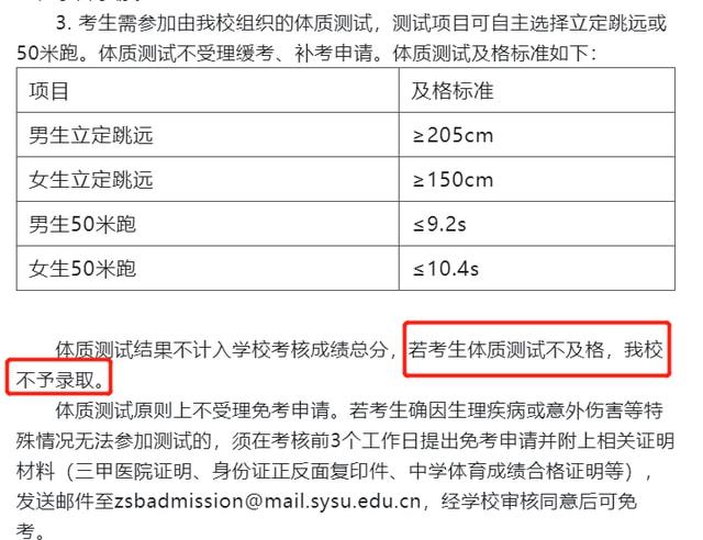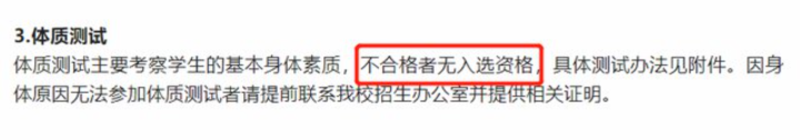 还有一些高校,对于体育测试比较严格,虽然在招生简章中说明,体质测试结果不计入学校考核成绩总分,但都重点强调了若考生体质测试不合格,我校不予录取;不合格者无入选资格的内容。例如中山大学和华南理工大学等。