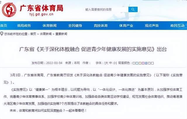 而在今年,广东省体育局和广东省教育厅联合印发《关于深化体教融合 促进青少年健康发展的实施意见》。文件中提出,开展大中小学校学生体育素质评价,逐步提高中考体育分值,高中成绩不合格者原则上不能毕业。