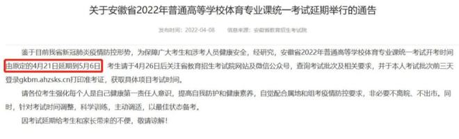 安徽省2022年普通高等学校体育专业课统一考试开考时间由原定的4月21日延期到5月6日。
