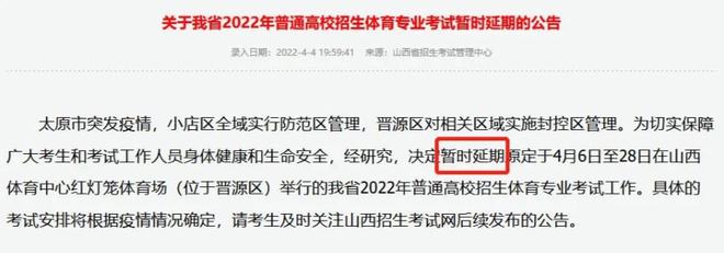 山西省决定暂时延期原定于4月6日至28日举行的2022年普通高校招生体育专业考试工作。