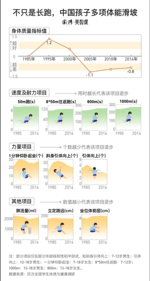 澎湃美数课也曾制作长图说明,不只是长跑,中国孩子多项体能滑坡,身体质量指标值、速度及耐力项目、力量项目、其他项目等多项指标均亮起红灯。