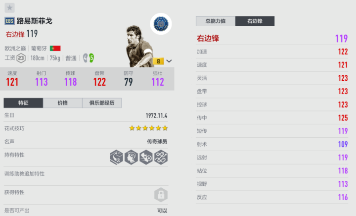 菲戈是葡萄牙“黄金一代”的领军人物,两次帮助葡萄牙挺进欧洲杯前四名、2006年带领球队打进世界杯前四名,这位球技精湛的世界足球先生,让葡萄牙足球重新焕发活力。 EBS赛季非常好的还原了菲戈的技术特点,将他在欧洲杯上的精彩表现复刻在游戏中。EBS菲戈是一名助攻能力强的边锋,当他来到边路附近,可以精准地找到埋伏在禁区内的前锋,“锁头式”传中让进球变得简单;下底后还可以观察防守情况,从人群中送出巧妙的倒三角回传。盘带和推进也是菲戈的强项,EBS菲戈虽然不是小快灵,但是他的控球很扎实,再利用不错的身体护球,可以巧妙的摆脱缠绕逼抢,赢得转身向前的空间。菲戈除了能当“绿叶”,还可以自行Carry充当“红花”,标志性的搓射及反角抽射都让人放心,是兼顾射门、传球和突破的全能型边锋,对球队前场进攻会起到极大帮助。