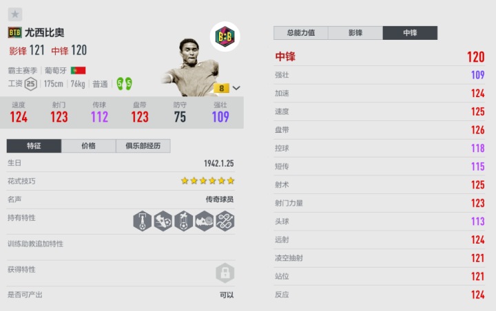 黑豹尤西比奥是“五盾军团”葡萄牙队的初代领航者,凭借他的优异表现,葡萄牙在1966年世界杯上取得了第三名的佳绩。在尤西比奥巅峰的几年时间里,他带领葡萄牙队高奏凯歌,成为当时的顶级强队之一,这也是葡萄牙足球的第一个“黄金盛世”。 游戏里的BTB尤西比奥同样有着极高的强度,在全明星阵容以及葡萄牙套里都有着靠前顺位。BTB尤西比奥延续了ICON的丝滑手感,控球细腻、盘带灵活,高速运动中也可以顺畅地急停变向过人。尤西比奥有着精湛的射术,远距离攻门和小角度抽射等都是拿手好戏;另外他还是双五脚,获得机会能直接打门而不需要调整。BTB尤西比奥适合反击战术,他能游走于越位线附近,高速启动后长途带球至禁区,1V1进球的能力很出色。由于工资限制,一些情况下用ICON赛季会影响整体工资分配,那么选择强度不输于ICON的BTB赛季,会是更佳的解决方案,想要提升前锋的玩家不可错过哦。