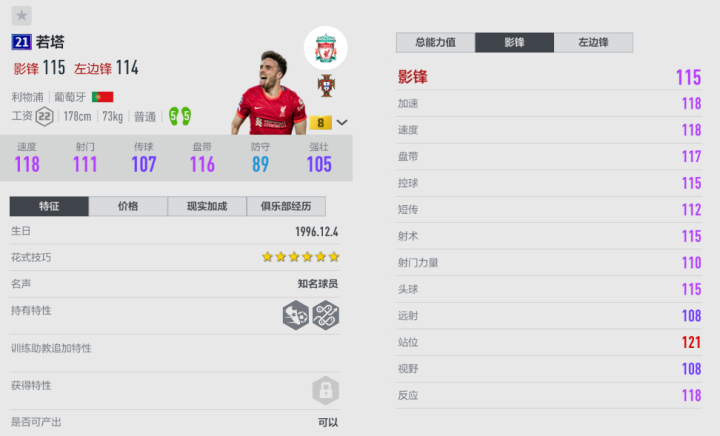 若塔是葡萄牙青年一代的锋线全能“杀手”,在老大哥C罗身边学习进步,逐渐显现了独当一面的能力。若塔对于新一代葡萄牙来说至关重要,他承担了未来“攻城拔寨”的重要任务,2022世界杯也许就是若塔证明自己的最佳舞台。 21U若塔的手感一如既往地细腻,具有很浓厚的南美风格,适合微操党玩家使用;用若塔做花式,衔接很顺畅并且空间小也能有机会过人。若塔对球的落点判断到位,接应横敲或传中时,往往能抢到第一落点破门,拥有很强抓机会能力;若塔的跑动迅速,在反击时可以突然前插赢得单刀球,并且双五脚也方便他做更多角度的选择。21U若塔具有“多面手”属性,除了司职中锋外,还可以打边锋和前腰,可以随时客串前场其他位置,对阵容的完整度有很好帮助。利物浦成功晋级,若塔后续还有增加能力值的机会,这是一张值得投资的“潜力卡”。 好了,以上就是本期“盘点葡萄牙队的中流砥柱”全部内容介绍,如果还用过其他好用的葡萄牙球员,欢迎大家在留言区分享出来,我们下期再见。