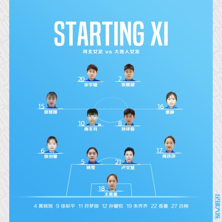 在首发阵容方面,主教练范轶颖延续了“442”的阵型,门将位置上派出了王美星,在后防线上,杨莹与卢文慧搭档中后卫,侯羽馨和周莎莎分居两侧;邵慧娜、庞丰月、孙评委和蔡静搭档中场,张雅凝和宋宇晴出任双前锋。