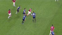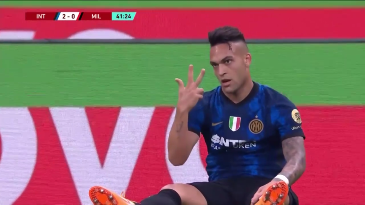 41分钟,劳塔罗再次在前场,在与托茉莉对抗中倒地。裁判吹罚对手犯规。