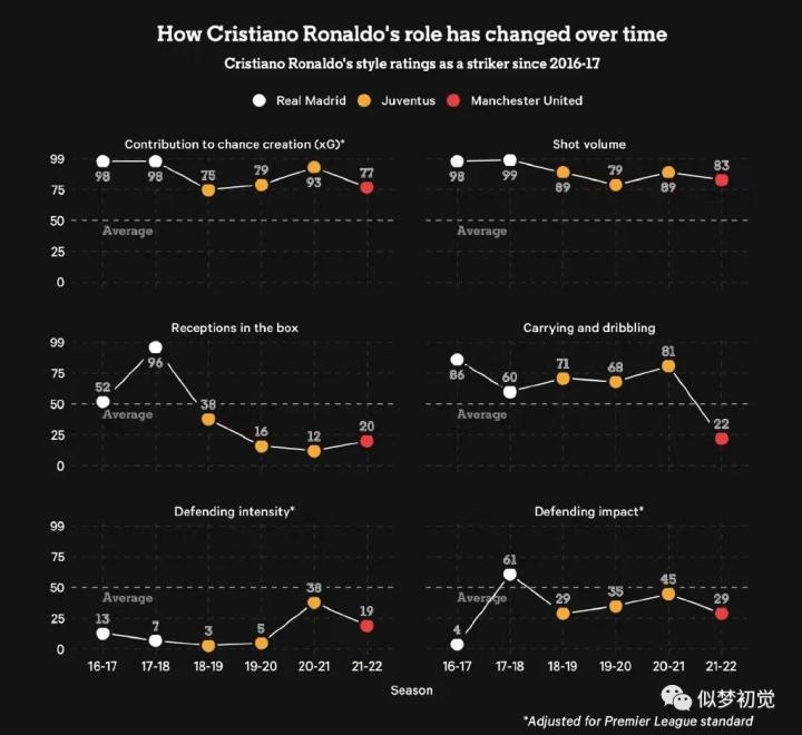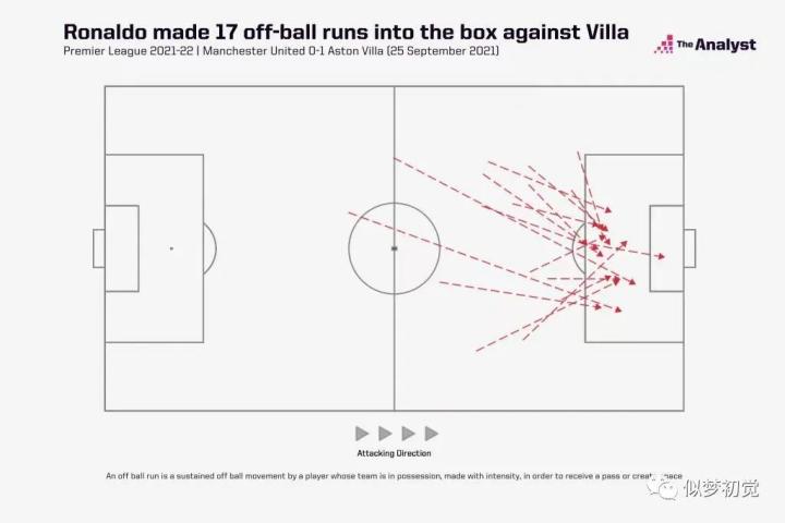 数据也能印证这一点,赛季前半段(索帅下课前)的315名非门将球员(至少出场了90分钟)中,有261人平均每分钟内的跑动距离胜过C罗。但是C罗有46%的无球跑动是往禁区内的冲刺,这一比例在英超所有前锋中位居第一。