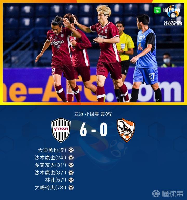 北京时间4月22日22:00,亚冠联赛小组赛J组的一场较量,由神户胜利船对阵清莱联。上半场,汰木康也梅开二度,大迫勇也、乡家友太各入一球,神户胜利船暂时4-0领先清莱联;下半场,林孔和大崎玲央扩大比分。最终,神户胜利船6-0大胜清莱联,继续领跑小组积分榜。