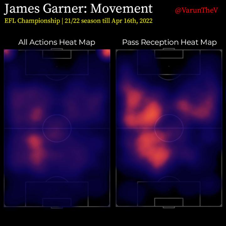 自那以后,加纳租借效力沃特福德和诺丁汉森林期间都出任类似的角色,通常都是中场衔接点或B2B机动型中场,会得到许可在场上大范围游走,创造机会和施压,而不是镇守中后场。本赛季加纳在诺丁汉森林延续了这一风格,下图是加纳的活动热图和接传球位置热图。