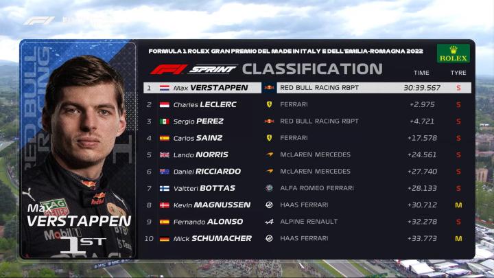 最终全场比赛结束,维斯塔潘完成对勒克莱尔的关键超越拿到第一,勒克莱尔第二,正赛中维斯塔潘和勒克莱尔将继续头排发车。佩雷兹第三,塞恩斯从第十位发车追至第四。