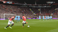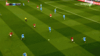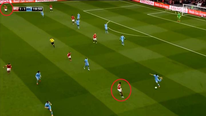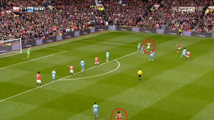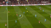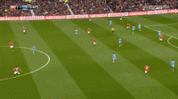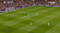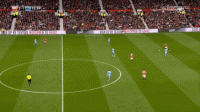 这一系列的防守选择牺牲了对球的压迫,但完成了对纵向、横向空间的保护,对对手核心球员的限制,最终只是让克里希送出一脚传中,菲尔-琼斯在短距离的冲刺中提前下脚,破坏了阿圭罗到前点的包抄射门: