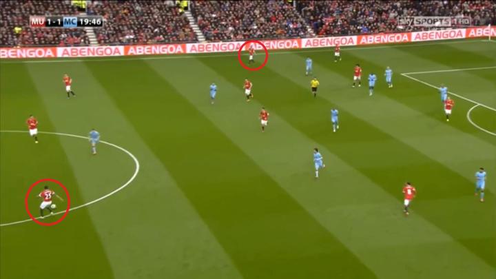 本场比赛,范加尔使用的中卫组合是菲尔-琼斯和斯莫林,这两人以身体层面的全面性为长,对抗之余,还有够格的跑动能力。斯莫林能在意甲打出名堂,就仰仗于此,而菲尔-琼斯年轻时稳定客串过边后卫和后腰,也是这一能力的体现。